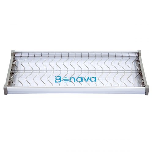 Kệ bát đĩa cố định tủ trên có cấu tạo hai tầng, một tầng úp bát và một tầng úp đĩa. Được cấu tạo từ các thanh nan tròn chắc chắn cách đều nhau tạo sự thông thoáng và tránh tối đa việc bát đĩa vị va đập. Hai khay hứng nước giúp nước không bị rơi xuống tủ hay mặt bàn bếp.