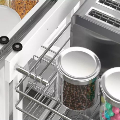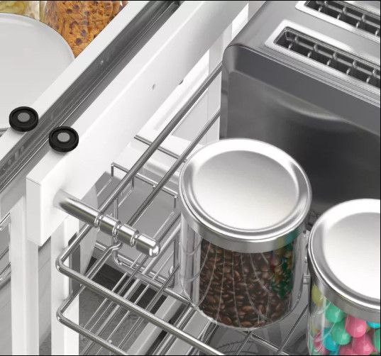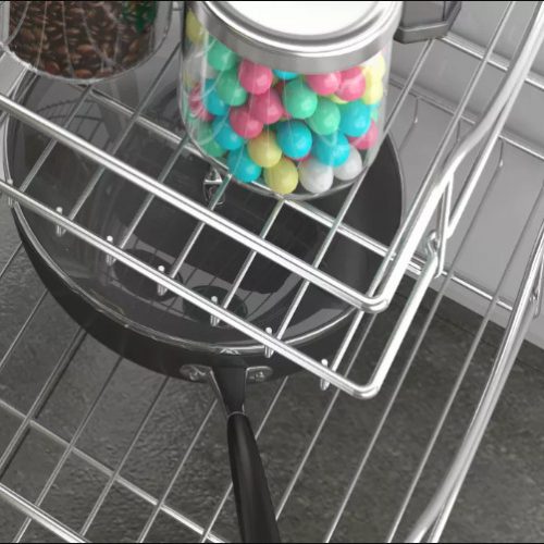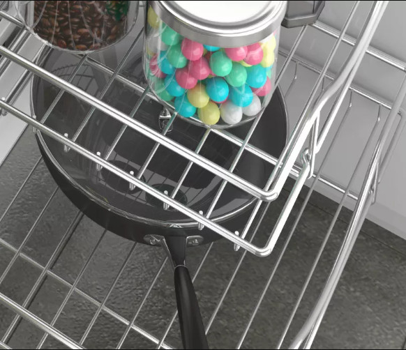 Với kết cấu hai tầng và bốn ngăn riêng biệt, kệ được đặt âm tủ bếp dưới và có thể kéo vào đẩy ra hoặc kéo sang hai bên linh hoạt. Kệ góc liên hoàn có thể sử dụng để đựng lọ gia vị, dao thớt hoặc các vật dụng phục vụ nấu nướng một cách gọn gàng và dễ dàng tháo lắp khi cần vệ sinh.